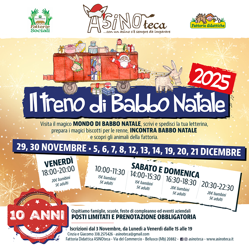 Gli asini sono gli abitanti principali della cascina dove speciali vagoni treno ospitano i nostri laboratori e sono ideali per l’organizzazione di feste di compleanno personalizzate.